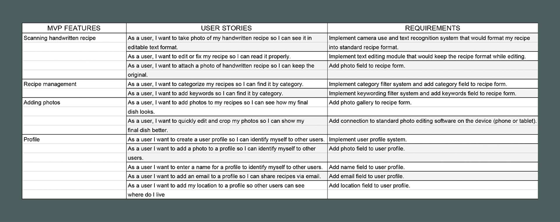 Staying with UX principles and with the development of personas and empathy maps, the next step was to make MVP and user stories.